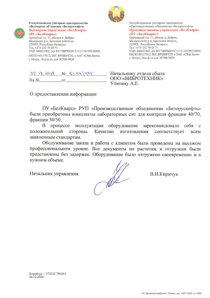 Подтверждение качества изготовления Сертификатом о калибровке и Свидетельством о поверке, оформленного аккредитованной лабораторией ООО "ВИБРОТЕХНИК"