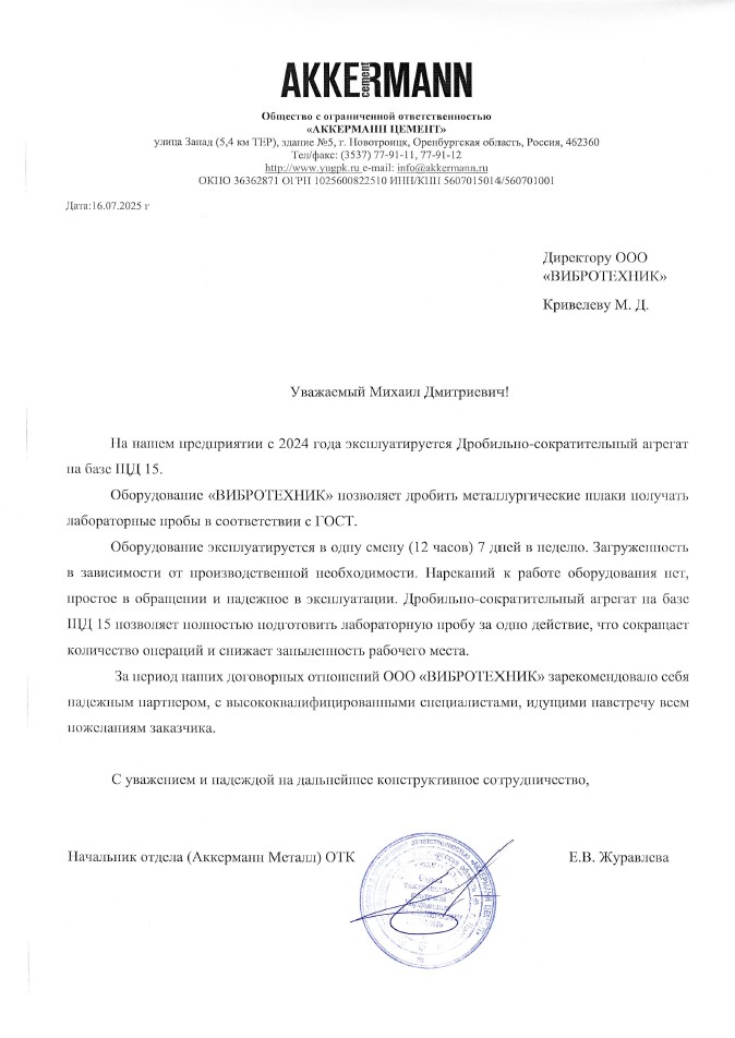 За период наших договорных отношений ООО «ВИБРОТЕХНИК» зарекомендовало себя надежным партнером, с высококвалифицированными специалистами, идущими навстречу всем пожеланиям заказчика.