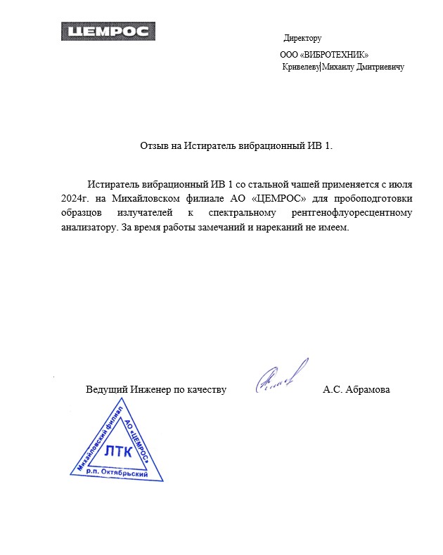 Истиратель вибрационный ИВ 1 со стальной чашей применяется с июля 2024 г. на Михайловском филиале АО «ЦЕМРОС» для пробоподготовки образцов излучателей к спектральному рентгенофлуоресцентному анализатору. За время работы замечаний и нареканий не имеем.